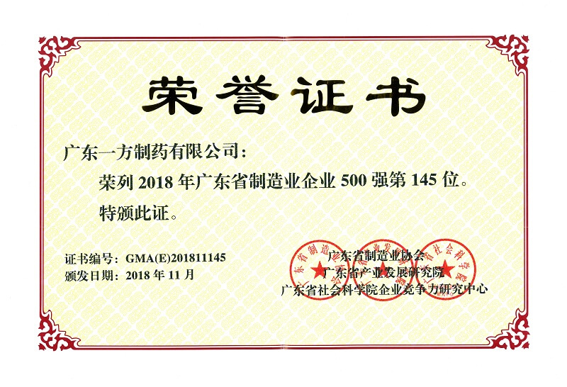 近日,2018广东省制造业发展年会暨广东制造业500强企业峰会举行,会上广东省制造业协会发布了《2018年广东省制造业500强企业研究报告》,华为投资控股有限公司、正威国际集团有限公司、广州汽车工业集团有限公司继续蝉联广东省制造业500强前三名。广东一方制药有限公司第四次入围,位列广东省制造业500强第145位,广东省医药行业第九位。